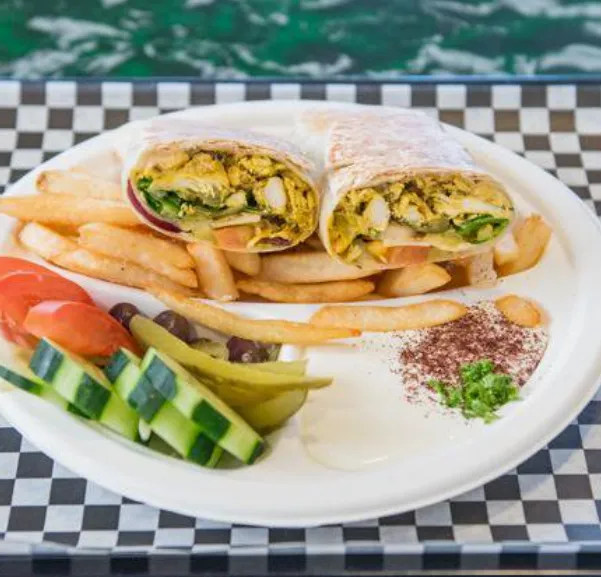 Savor our unique take on the gyro sandwich, featuring hummus, gyro chicken meat, tangy feta cheese, crisp lettuce, tomatoes, onions, cucumbers, and garlic sauce, all wrapped in fluffy pita bread.