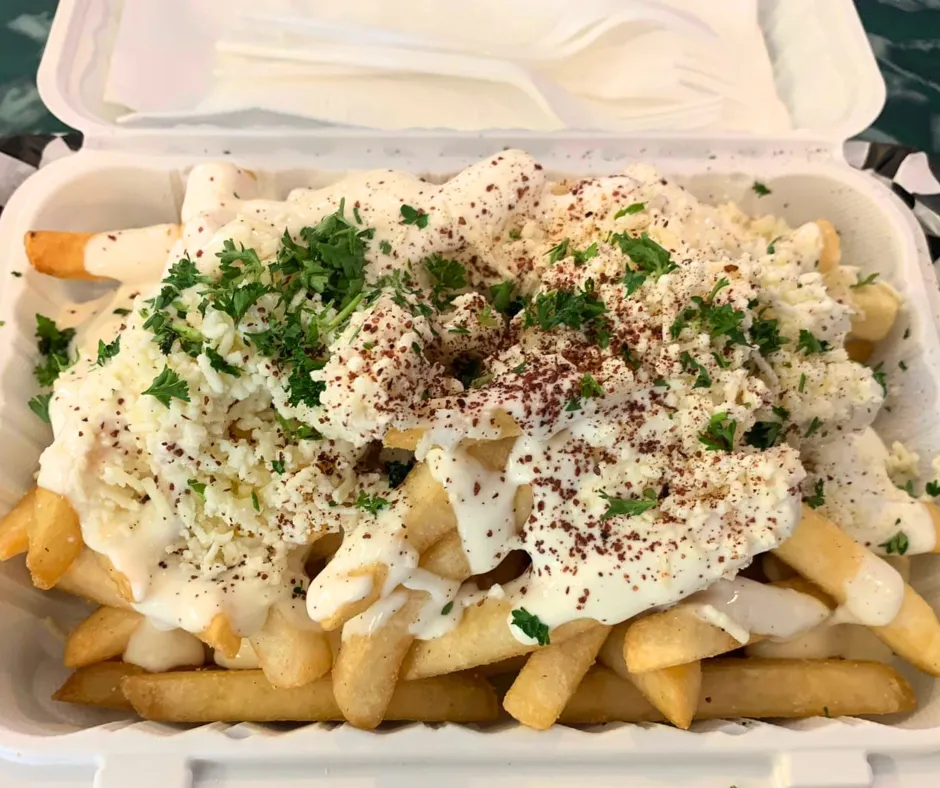 Indulge in our flavorful fries topped with garlic sauce, tangy feta cheese, and fresh parsley, available in medium or large sizes.