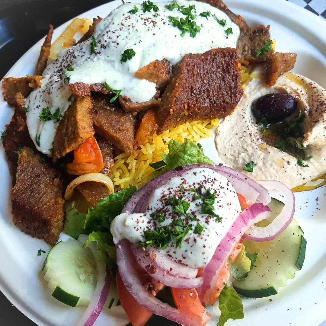 Delight in a satisfying plate of rice, chicken or beef shawarma meat, creamy hummus, a side of salad with feta cheese, garlic sauce, and a fluffy pita.