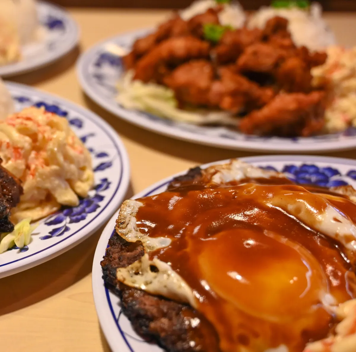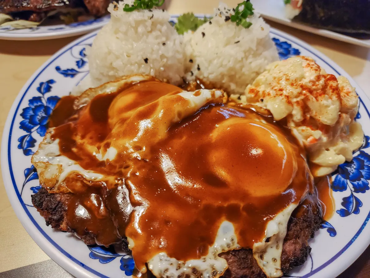 A juicy burger patty topped with an over-easy egg, and savory gravy served over fluffy rice — a hearty, flavorful Hawaiian staple.