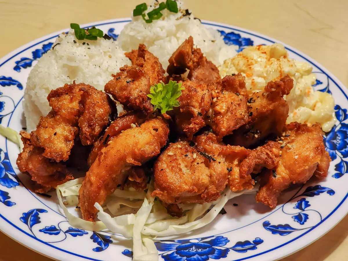 Marinated chicken coated in sweet mochiko batter, fried to crispy perfection, and served atop fluffy rice for a satisfying meal.